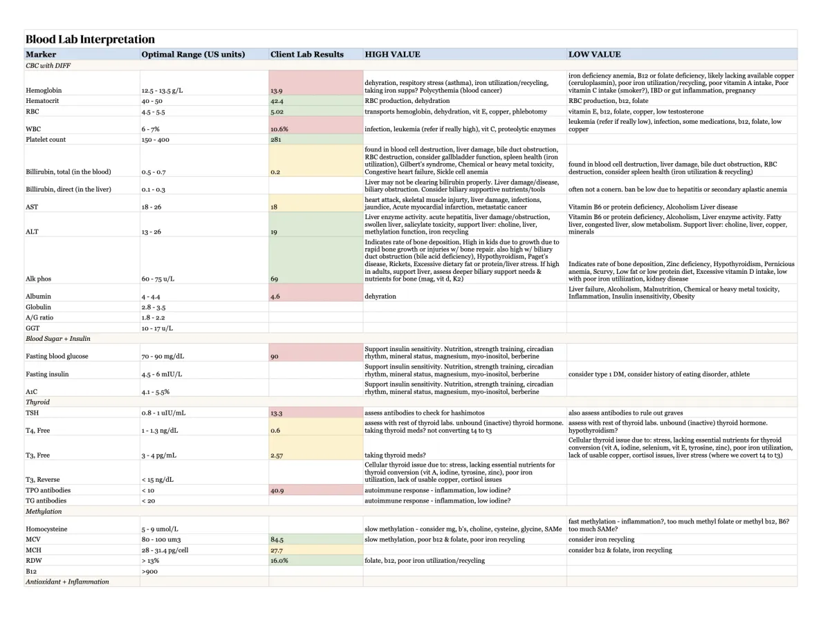 I don't guess what's wrong—I test for it. While standard prenatal and postpartum labs are designed to catch obvious disease, I use functional testing and blood lab ranges that reveal the dysfunction affecting your day to day life. The test you see here gives me a 3-month snapshot of your current nutrient status. If you've been told your labs look “normal” but you don't feel normal, this is the missing link.